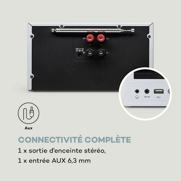 - Connexions : 1 x sortie haut-parleur, 1 x entrée AUX, 1 x sortie casque