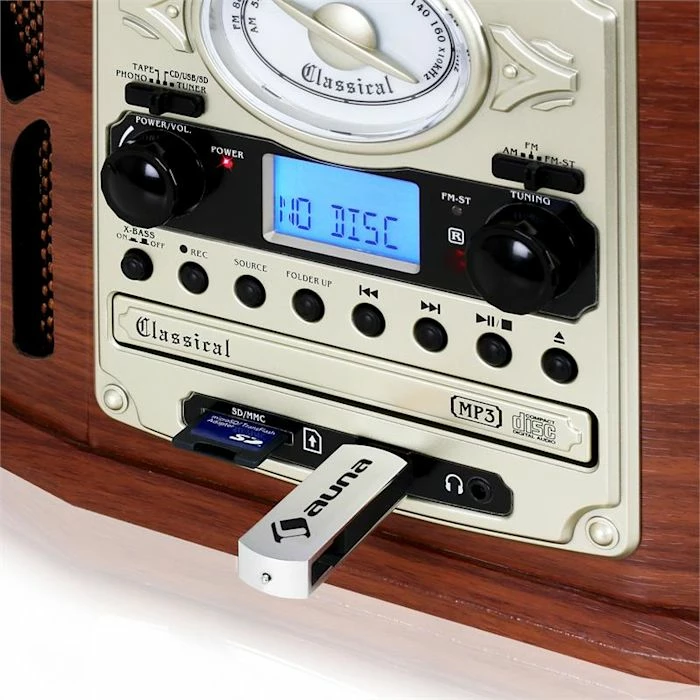 - chaîne stéreo multifonctions avec lecteur CD, radio AM/FM, entrées USB et SD, platine disque et lecteur cassette