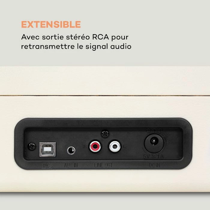 - Connectique : 1 x sortie USB (type B), 1 x sortie RCA, 1 x sortie écouteurs (prise jack de 3,5 mm), 1 x entrée stéréo-Line-In (AUX)