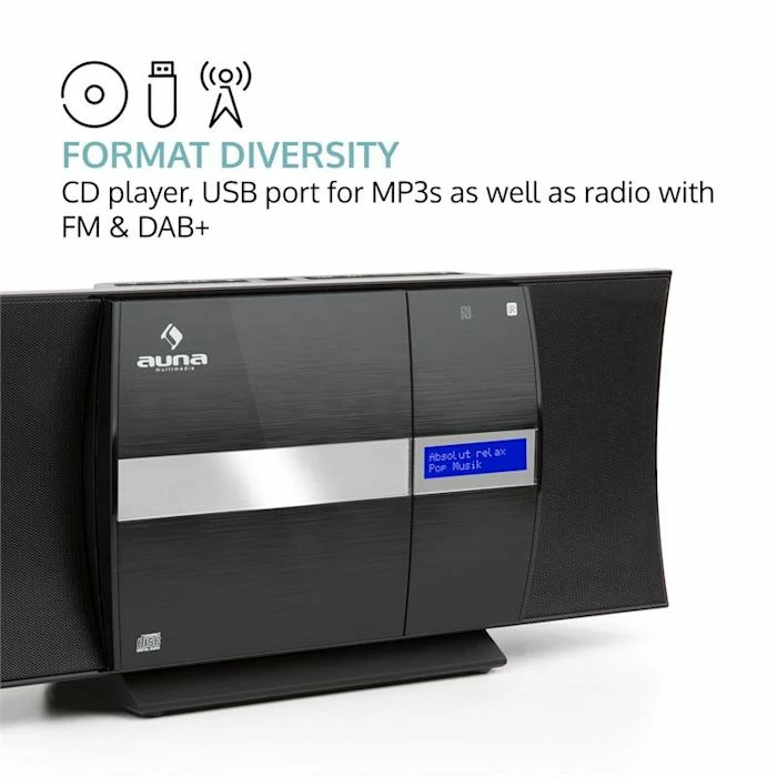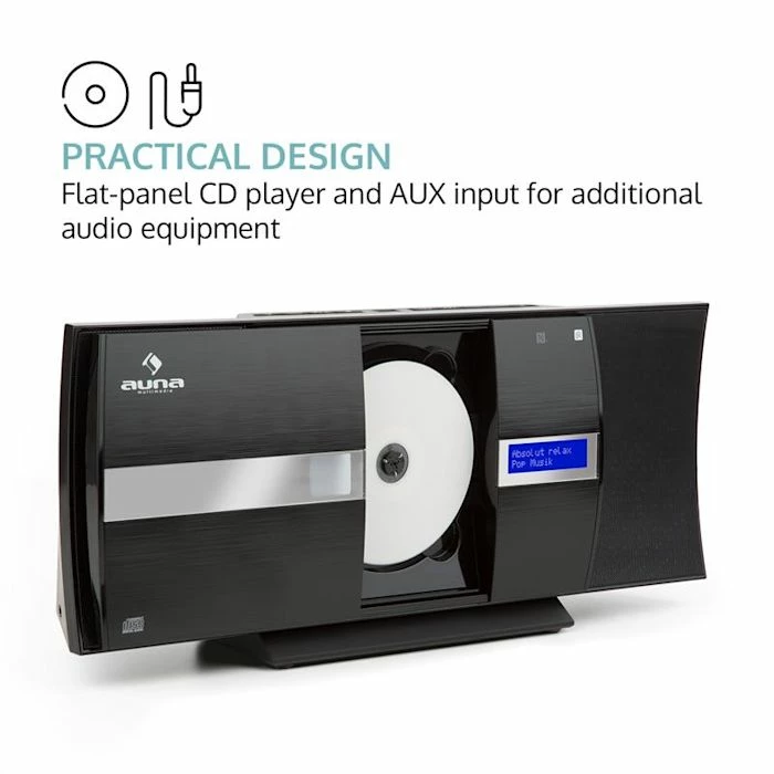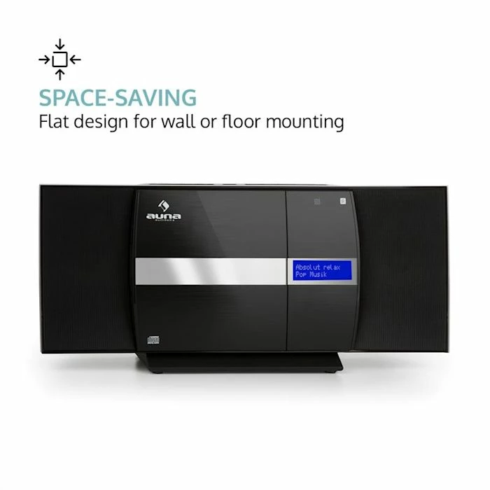 Le V-20 de auna est une mini-chaîne stéréo multifonctionnelle qui est adaptée au montage mural grâce à un design plat économe en espace et un pied amovible et elle offre de multiples options de lecture et de formats pour rendre votre quotidien plus doux avec vos sons préférés.