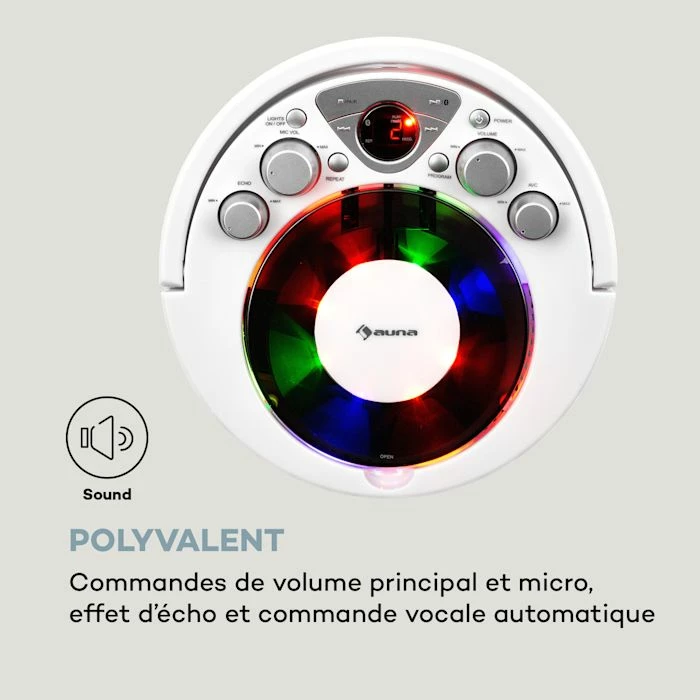 - Polyvalent : bouton de réglage du volume principal et du microphone, ainsi qu’un effet d’écho et une commande vocale automatique