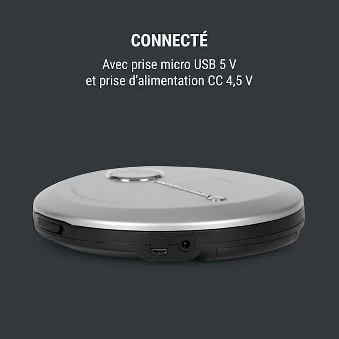 Le retour d’une légende : avec le discman oneConcept CDC 100MP3, le CD revient dans son usage portable, et ca avec la technique la plus moderne ! Il peut reconnaitre et lire les formats CD, CD-R, CD-RW et MP3-CD. Grâce à son fonctionnement sur piles, pas besoin de source d’énergie, et vous pourrez écouter jusqu’à 8 heures de musique où que vous soyez. A la maison, si vous le souhaitez, il fonctionne aussi sans problème à l’aide d’un bloc d’alimentation ou d’un câble micro-USB à brancher dans le port correspondant.